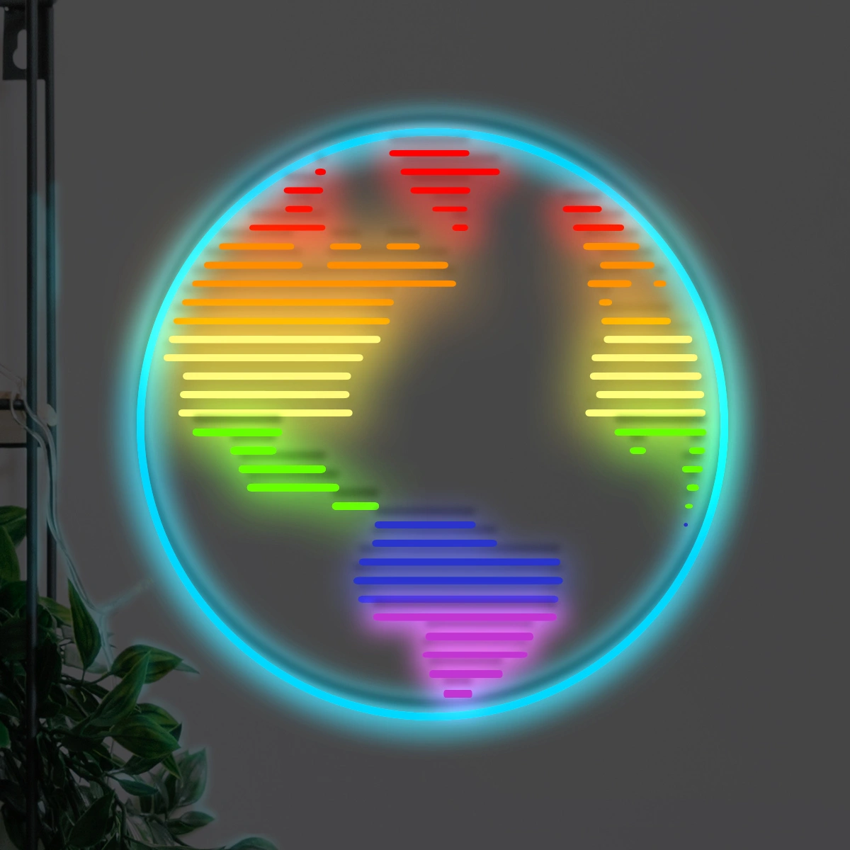 Neon tęcza sprawia, że mapa świata staje się „żywa”: kolory płynnie przechodzą jeden w drugi, podkreślając kontynenty i ich sylwetki tak, że chce się je oglądać. W przestrzeni roboczej taka mapa świata LED przypomina zespołowi o skali pomysłów i klientów, z którymi pracujecie, a w edukacyjnej — pobudza zainteresowanie geografią i różnymi kulturami.